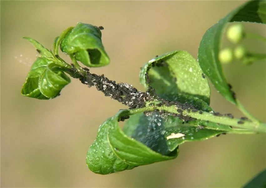 Im Frühjahr sitzen schwarze Blattläuse in großer Zahl an jungen Trieben und Blättern. Durch die Saugtätigkeit können Blätter und Triebe verkrüppeln. Die zuckerhaltigen Ausscheidungen der Tiere verkleben die Blätter. Auf diesem Honigtau siedeln sich sehr bald schwarze Rußtaupilze an.