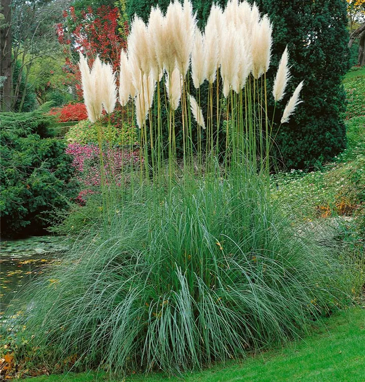Das Pampasgras rosa und weiß (Cortaderia selloana) ist ein dekoratives Gestaltungselement im Garten, welches sich an einem sonnigen Standort mit einem möglichst durchlässigen, humosen, nährstoffreichen Boden am wohlsten fühlt. Bei günstigen Bedingungen erreicht dieses winterharte Gras eine Höhe von ca. 1,5 m und wird bis zu 1,5 m breit.