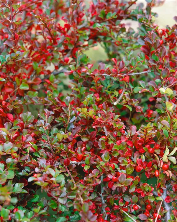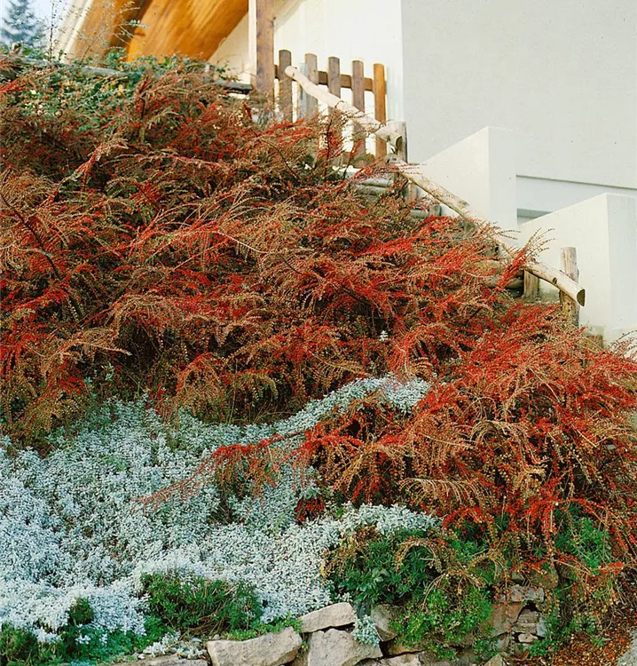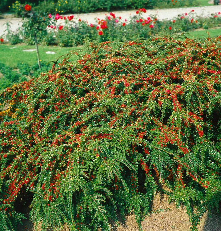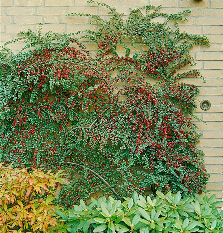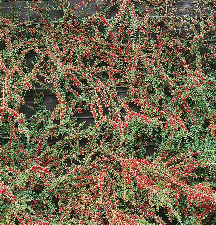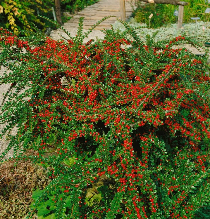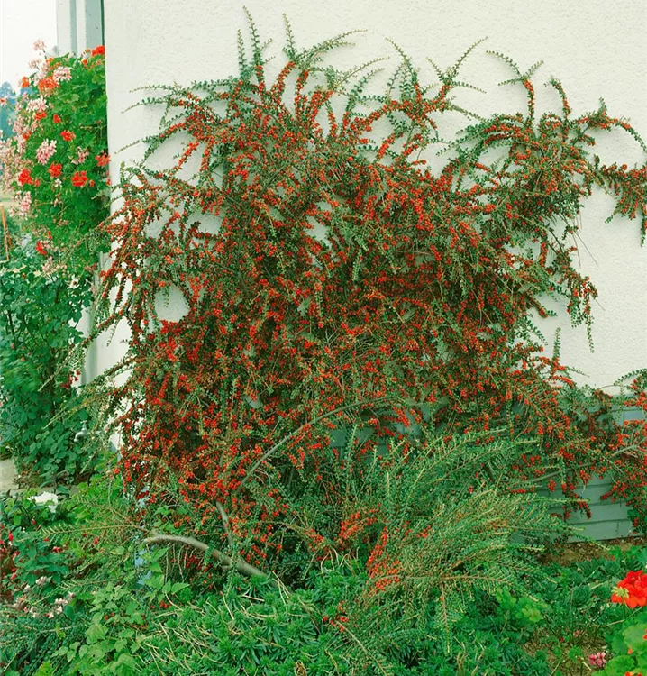 Besonders dekorativ sind die roten, runden Früchte von Cotoneaster horizontalis. Diese erscheinen ab September. Haften sehr lange.