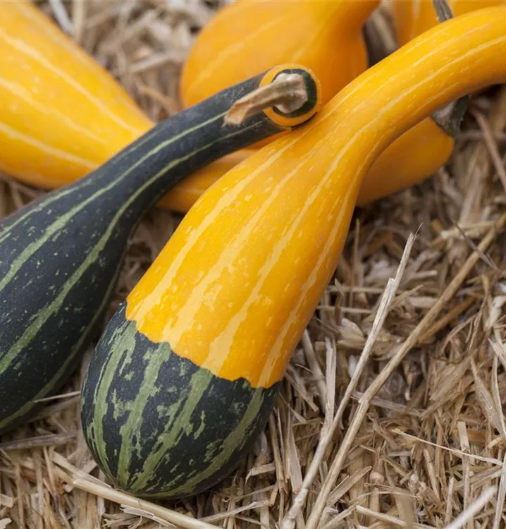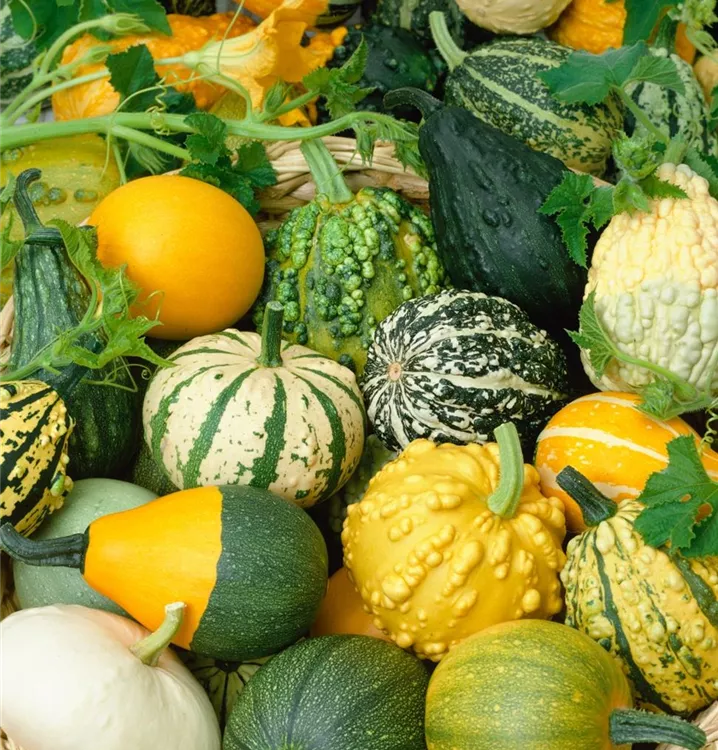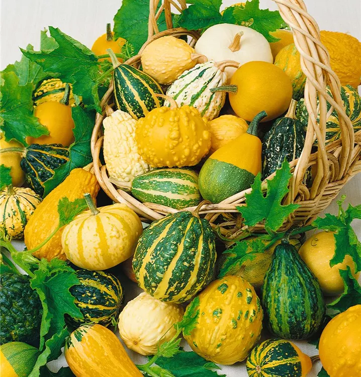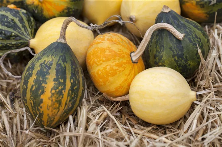 Der Zierkürbis (Cucurbita pepo) bildet Früchte, die aromatisch schmecken und bereits ab September geerntet werden können. Für das optimale Wachstum des Zierkürbises werden ein sonniger Standort und durchlässiger, nährstoffreicher Boden benötigt.