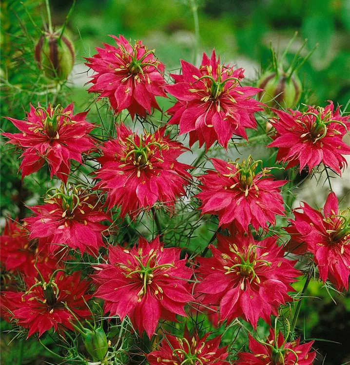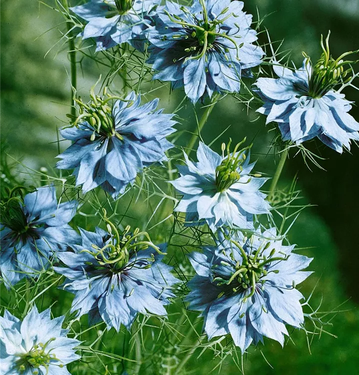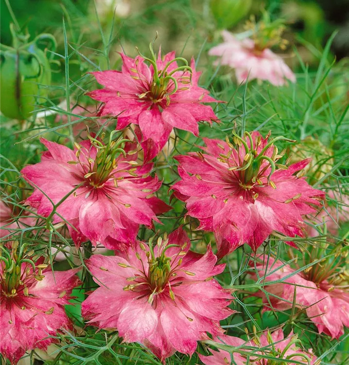 Die Jungfer im grüne (Nigella damascena) ist eine beliebte Pflanze für den Balkon. Die unzähligen Blüten erscheinen, je nach Sorte, in verschiedenen Farben die ganze Saison hindurch. Ein sonniger Standort und ein durchlässiges Substrat werden bevorzugt.