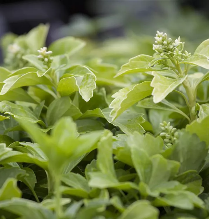 Das Dickmännchen (Pachysandra terminalis) ein ausläuferbildender, kriechender Halbstrauch, der, je nach Sorte, Blüten in verschiedenen Farben hervorbringt. An einem halbschattigen bis schattigen Standort mit humosem, lockerem Boden erreicht es gewöhnlich eine Höhe von ca. 30 cm und wird ca. 50 cm breit.