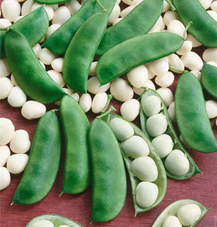 Die Hülsenfrüchte haben einen aromatischen Geschmack. Reifezeit ab Juli. Die Hülsenfrüchte sind länglich.