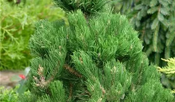 Die Schwarzkiefer (Pinus nigra) ist ein Gehölz, welches kegelförmig wächst und gewöhnlich eine Höhe von ca. 25 m und eine Breite von ca. 10 m erreicht. Ihre nadelförmigen Blätter haben eine dunkelgrüne Färbung. Dekorative braune Zapfen zieren Pinus nigra ab September. Dieses Gehölz ist gut frostverträglich. Sie bevorzugt durchlässigen, kalkhaltigen, sandigen Boden in sonniger Lage.
