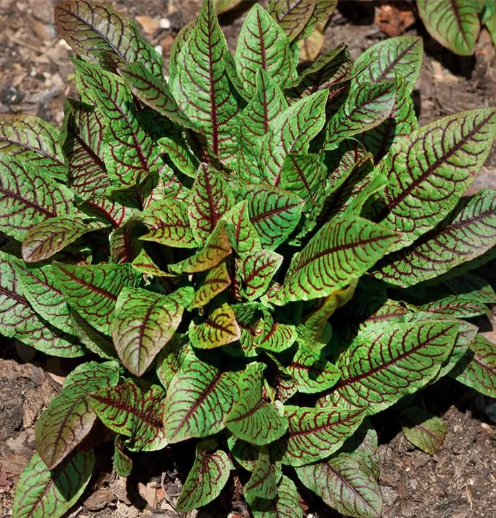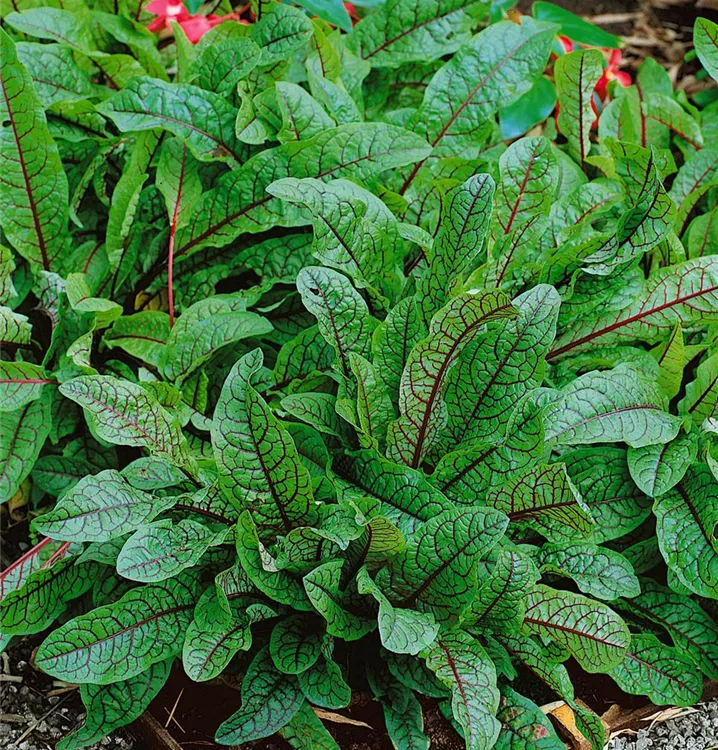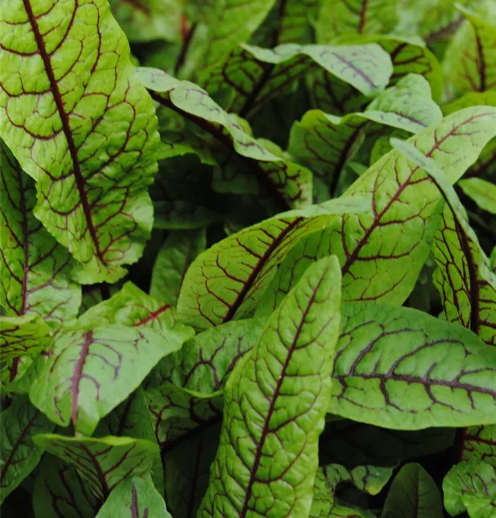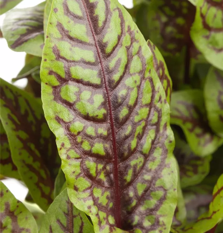 Zum Verzehr geeignet. Die mittelgrünen, dunkelrot geäderten, gewellten Blätter sind lanzettlich und überzeugen mit säuerlichem Geschmack.