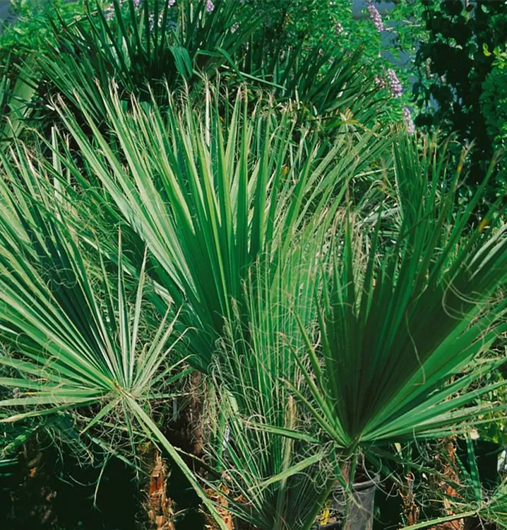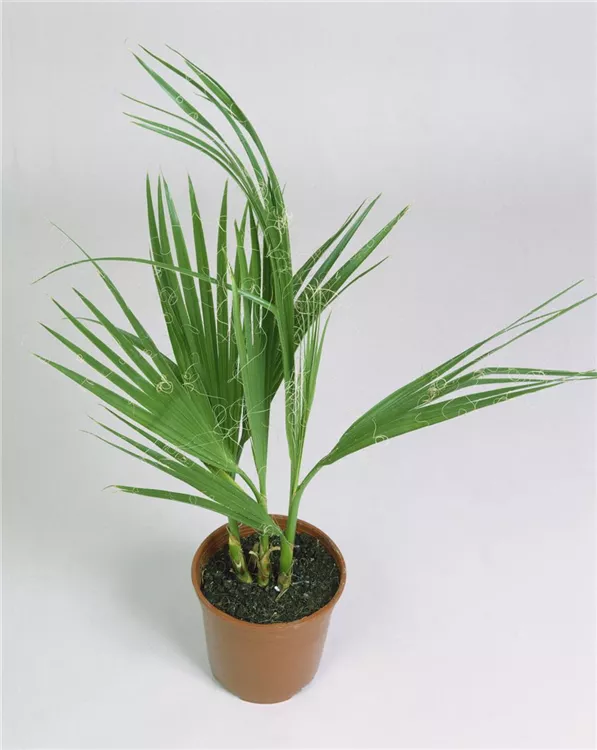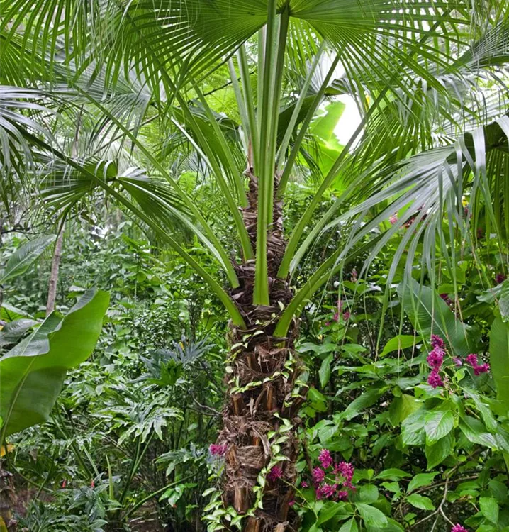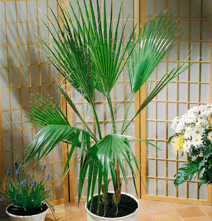 Die Kalifornische Washingtonpalme (Washingtonia filifera) ist eine sehr beliebte Kübelpflanze. Ihre dekorativen Blüten erscheinen von Juli bis August. Verwenden Sie bevorzugt die spezielle Kübelpflanzenerde, denn sie verdichtet sich über längere Zeit nicht.