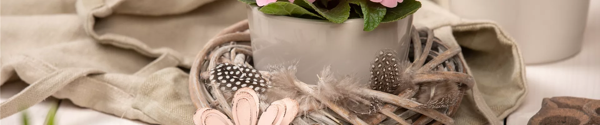 Alle Frühlingsblüher lassen sich gut mit anderer Osterdekoration wie zum Beispiel selbst bemalten oder gekauften Ostereiern oder kleinen Häschen kombinieren. Wer sich eine möglichst natürliche Dekoration wünscht, kann in eine Vase mit Schnittblumen aber auch einige Zweige stellen. Hierfür eignen sich zum Beispiel Zweige von Haselnusssträuchern oder der Korkenzieherweide. Durch die Wärme in den Wohnräumen sprießen bald die ersten Blätter. Dies nimmt jedoch etwas Zeit in Anspruch, deshalb werden Zweige am besten schon eine oder zwei Wochen vor Ostern in eine Vase gestellt. Eine beliebte Osterdekoration sind außerdem Körbe aller Art. Sie lassen sich mit schönen Frühlingsblühern wie den Narzissen, Hyazinthen oder mit kleinen Hornveilchen bepflanzen. Mit weiterer Deko wie zum Beispiel ein wenig Moos entsteht ein Ensemble für den Tisch oder den Platz vor der Haustür. Weil Frühlingsblüher winterhart sind, kann der Korb selbst bei sehr niedrigen Temperaturen im Freien bleiben. Ein wenig Vorsicht ist jedoch bei Frühlingsblühern aus dem Gewächshaus geboten. Sie sollten langsam an die Kälte gewöhnt und deshalb an den ersten Abenden möglichst ins Haus geholt werden.