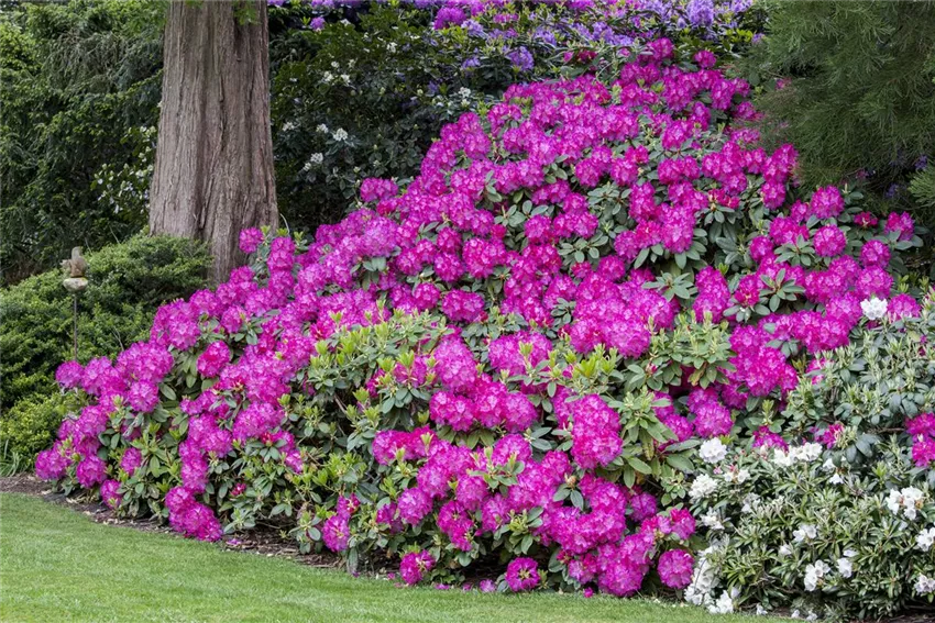 Der Rhododendron ist mit seiner Blütenpracht im Frühling ein beliebter Gartenstrauch. Aber welche Bäume passen am besten dazu? Nur Rhododendron wird schnell langweilig, da die Sträucher leider nur einmal im Jahr blühen. Als Begleitbaum eignet sich die Kiefer ( Pinus ) ideal. In ihrem lichten Schatten fühlt sich der Rhododendron sehr wohl und die Ansprüche der Pflanzen ergänzen sich optimal. Wichtig ist vor allem, dass die Begleitbäume Tiefwurzler sind, da die flachwurzelnden Rhododendronwurzeln nicht sehr konkurrenzfähig sind. Gut als Partner eignen sich auch Zeder ( Cedrus ), Lärche ( Larix ) und Urwelt-Mammutbaum ( Metasequoia glyptostroboides ). Wer Laubbäume bevorzugt, kann Stiel-Eiche, Trauben-Eiche ( Quercus robur und Quercus petraea ) oder Edel-Kastanie ( Castanea sativa ) pflanzen.