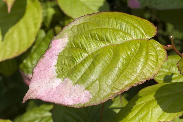 Der Scharfzähnige Strahlengriffel (Actinidia kolomikta) ist eine kletternde, Gartenpflanze mit dekorativen sommergrünen, eiförmigen, mehrfarbigen Blättern.