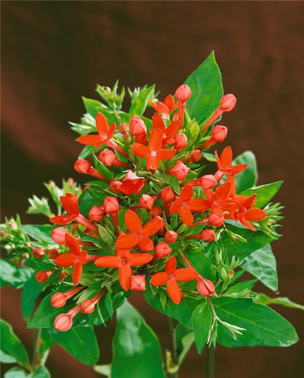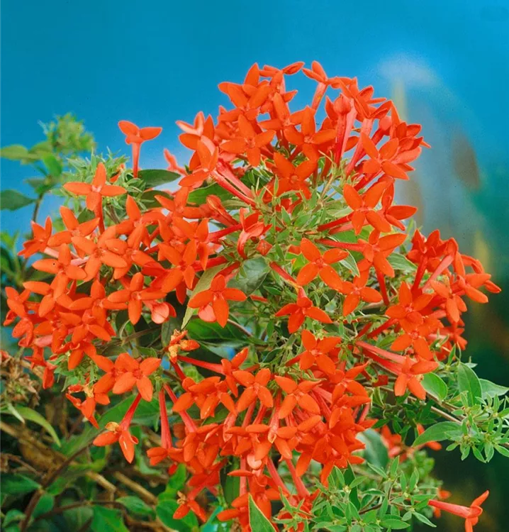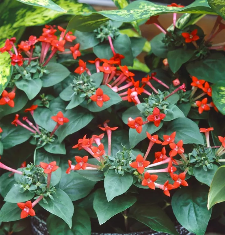 Die Bouvardie (Bouvardia, rot) blüht über Monate hinweg. Je nach Sorte, erscheinen die dekorativen Blüten in den Farben Rosa, Rot und Weiß. Bevorzugt wird ein heller Standort und eine durchlässige Erde.