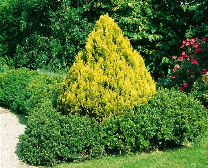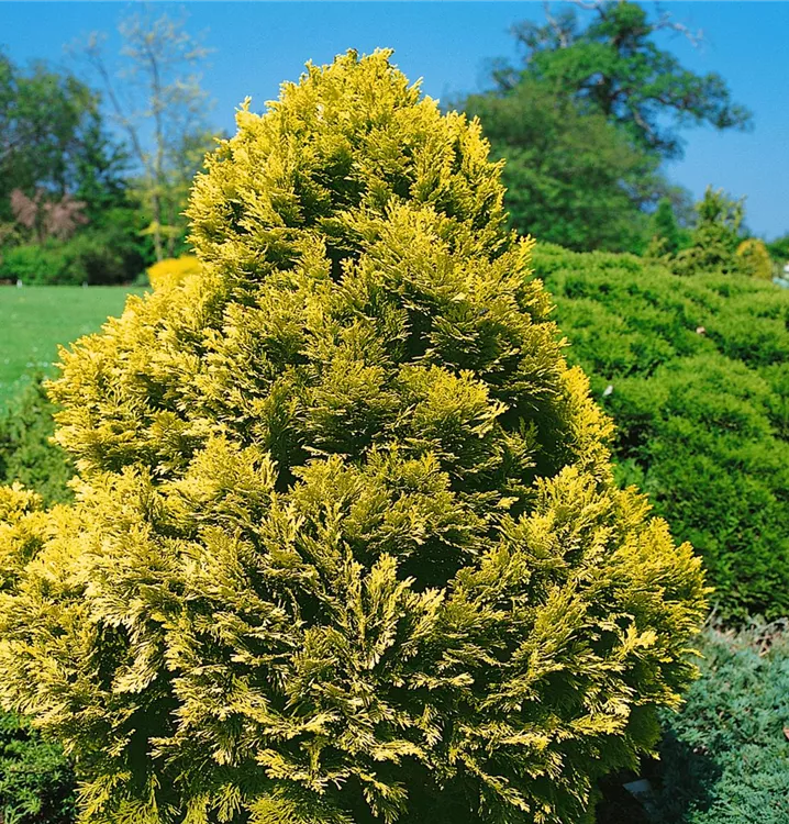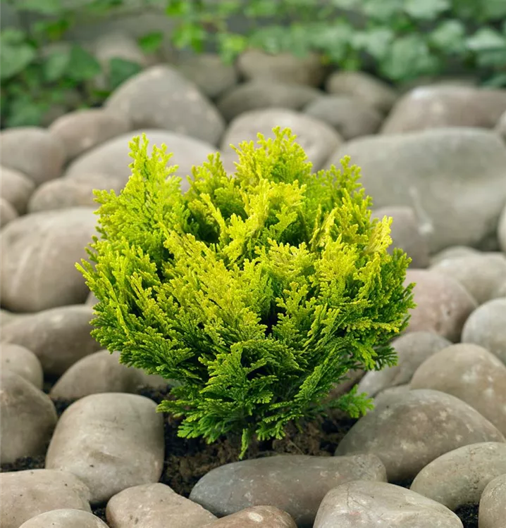 Die Gelbe Kissenzypresse 'Minima Aurea' (Chamaecyparis lawsoniana) ist ein Großbaum oder Kleinstrauch, welcher kegelförmig wächst und gewöhnlich eine Höhe von ca. 1 m und eine Breite von ca. 1 m erreicht. Ihre schuppenförmigen Blätter haben eine dunkelgrüne oder gelb-grüne Färbung. Dieses Gehölz ist gut frostverträglich. Sie bevorzugt durchlässigen, nährstoffreichen Boden in sonniger bis halbschattiger windgeschützter Lage.