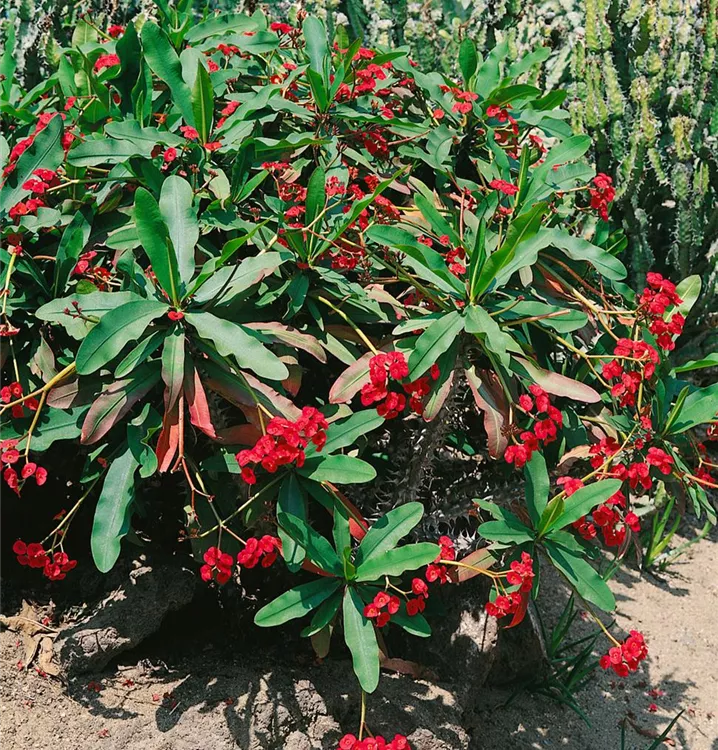 Der Christusdorn (Euphorbia milii) ist eine rot blühende Pflanze, die lanzettliche, mittelgrüne Blätter trägt. Seine tellerförmigen Blüten erscheinen in Trugdolden von November bis April. Diese kompakte und strauchartige Pflanze gedeiht am besten an einem sonnigen Standort.