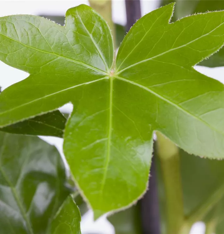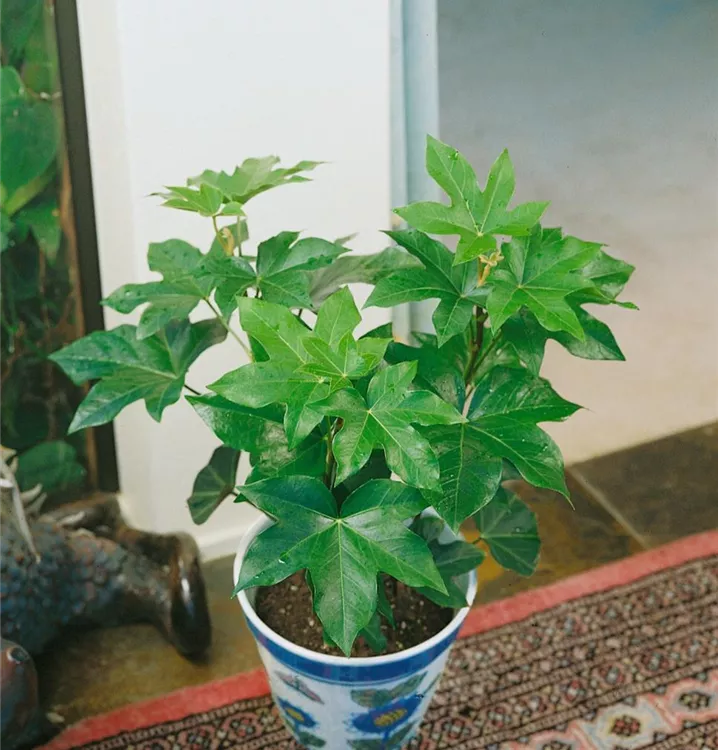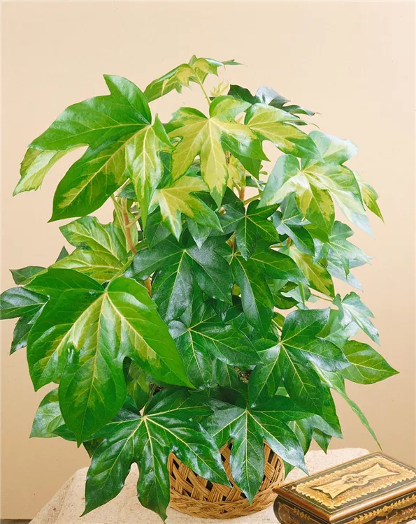 Die immergrünen Blätter der Efeuaralie sind mehrfarbig, geschnitten, ganzrandig.