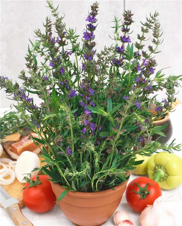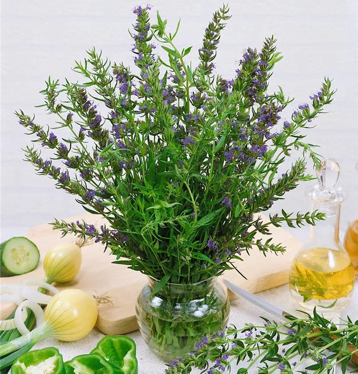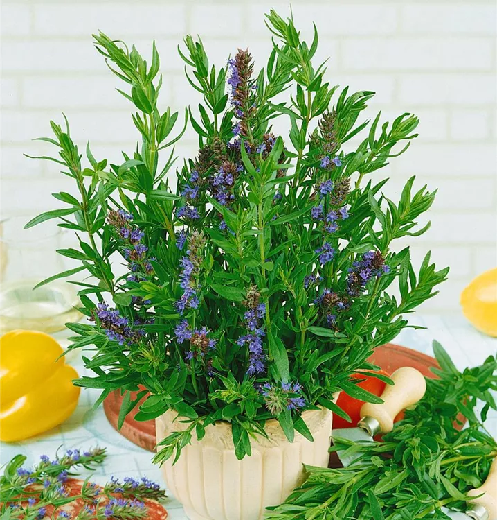 Der Apotheker-Ysop (Hyssopus officinalis) ist eine angenehm duftende Kräuterpflanze mit einem aromatischen Geschmack. Seine mittelgrünen Blätter sind lanzettlich. Für das optimale Wachstum des Apotheker-Ysops werden ein sonniger Standort und durchlässiger, nährstoffreicher Boden benötigt.
