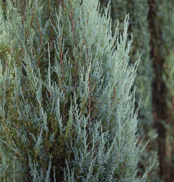 Der Virginische Wacholder 'Blue Arrow' ist immergrün. Seine Nadeln sind blau-grau, schuppenförmig.