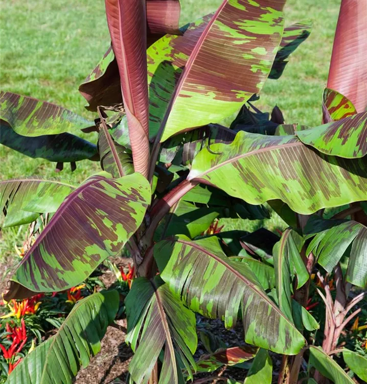 Die immergrünen Blätter der Essbanane sind mehrfarbig, eiförmig.