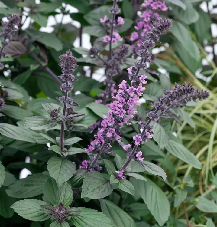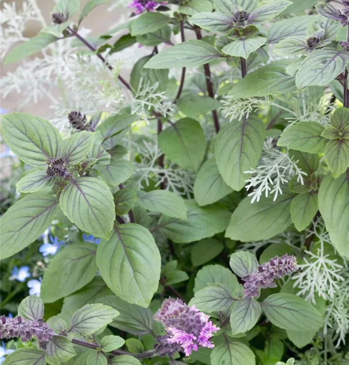 Das Garten-Basilikum 'Magic Blue' (Ocimum basilicum) ist eine Kräuterpflanze mit einem würzigen Geschmack. Seine grünen Blätter sind eiförmig und gewellt. Für das optimale Wachstum des Garten-Basilikums 'Magic Blue' werden ein sonniger Standort und durchlässiger, nährstoffreicher Boden benötigt.