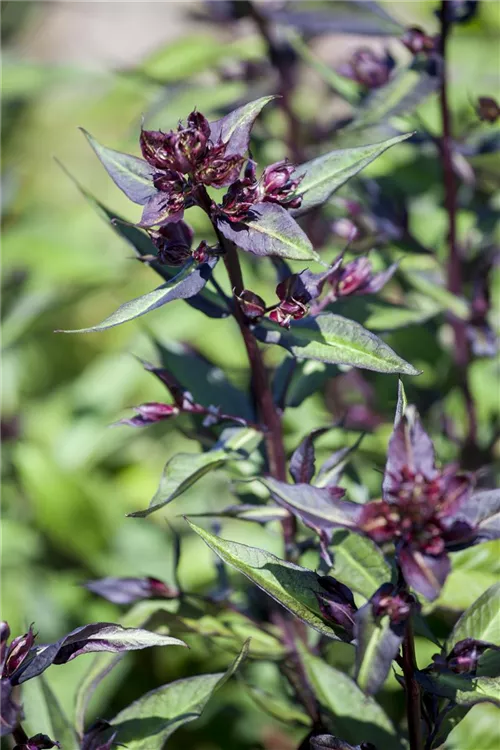 Zum Verzehr geeignet. Die grünen, violett geäderten, gewellten Blätter sind eiförmig und überzeugen mit würzigem Geschmack.