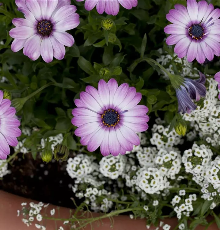 Das Kapkörbchen (Osteospermum ecklonis) ist eine beliebte Pflanze für den Balkon. Die unzähligen Blüten erscheinen, je nach Sorte, in verschiedenen Farben die ganze Saison hindurch. Ein sonniger Standort und ein durchlässiges Substrat werden bevorzugt.
