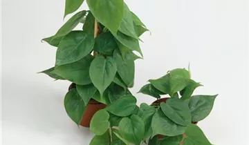 Der Philodendron (Philodendron scandens) trägt dunkelgrüne, herzförmige Blätter. Diese rankende Pflanze gedeiht am besten an einem hellen bis schattigen Standort.