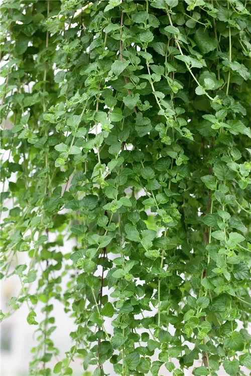 Das Hänge-Bohnenkraut 'Indian Mint' (Satureja douglasii) ist eine Kräuterpflanze mit einem minzigen Geschmack. Seine hellgrünen Blätter sind rundlich und gewellt. Für das optimale Wachstum des Hänge-Bohnenkrauts 'Indian Mint' werden ein sonniger Standort und durchlässiger, nährstoffreicher Boden benötigt.
