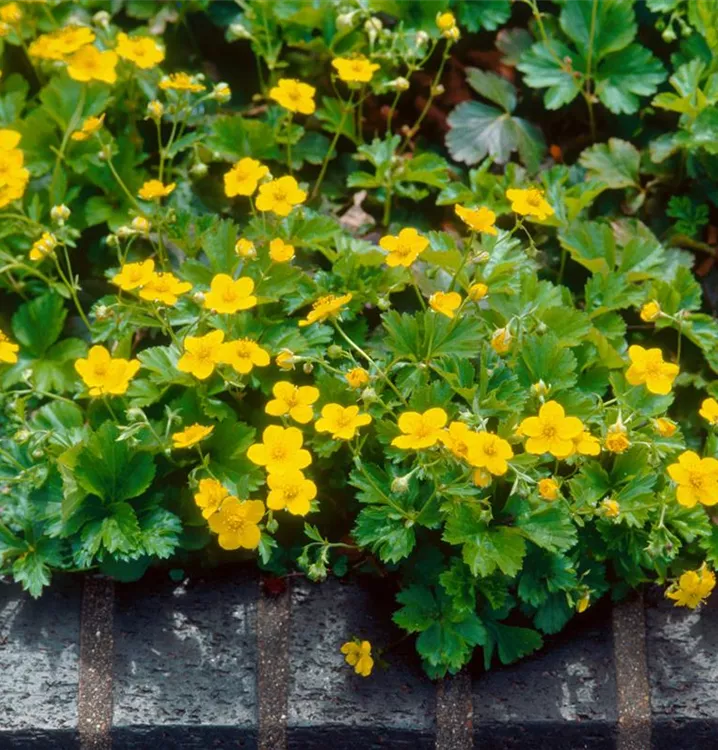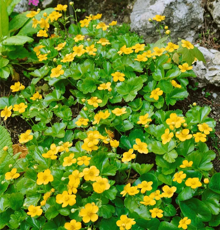 Waldsteinia ternata bildet schalenförmige, gelbe Blüten ab April.